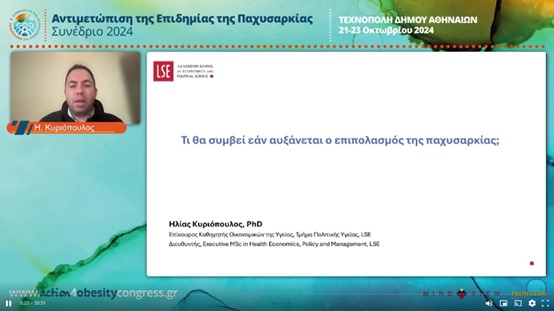 Ασφαλώς, η αύξηση αυτή του παγκόσμιου επιπολασμού της παχυσαρκίας έχει επιπτώσεις και στα οικονομικά των συστημάτων υγείας, παρατήρησε ο ομιλητής. Ένα σημαντικό ποσοστό των δαπανών υγείας για αρκετά νοσήματα οφείλεται στην παχυσαρκία και, εάν ο επιπολασμός της παχυσαρκίας συνεχίσει να αυξάνεται, εκτιμάται πως σε λίγες δεκαετίες η χώρα θα δαπανά το 9% του προϋπολογισμού υγείας σε νοσήματα που σχετίζονται με την παχυσαρκία και την υπερβαρότητα. Η παχυσαρκία φαίνεται πως σχετίζεται με πάνω από 70% της δαπάνης για τον διαβήτη, περίπου 20% της δαπάνης για τα καρδιαγγειακά νοσήματα και 10% της δαπάνης για τον καρκίνο, εξήγησε ο κ. Κυριόπουλος.